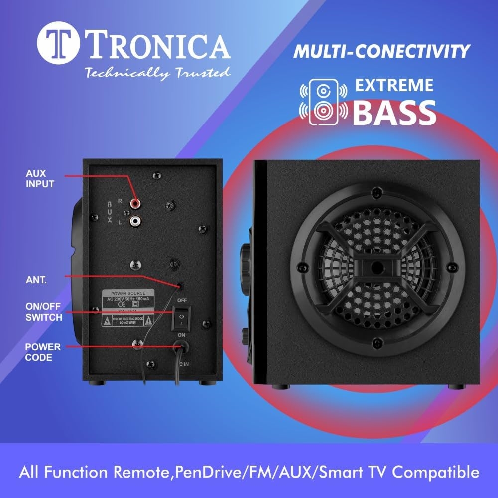 Enjoy 3.0 is the BASANT PANCHMI launch from ur own brand TRONICA! Enjoy model has been the great seller, according to the features and price. This third version of ENJOY has the additional RGB dancing lights with improved sound quality. Transform your entertainment experience with this versatile 30W mini home theatre system. The sleek black design features a powerful all range speaker that deliver rich, room-filling sound. Enhanced with RGB lights, this system creates an immersive atmosphere perfect for movies, music, and gaming. The comprehensive connectivity options include Bluetooth for wireless streaming, USB port for pendrive playback, FM radio, and AUX input to connect various devices including smart TVs. The included remote control puts all functions at your fingertips, allowing easy adjustment of volume, and input sources from anywhere in the room. The compact yet powerful speakers are ideal for both small living spaces and bedrooms, providing clear highs and deep bass for an engaging audio experience. Whether you’re watching films, enjoying music, or hosting a party, this system delivers impressive sound quality in a space-saving design.